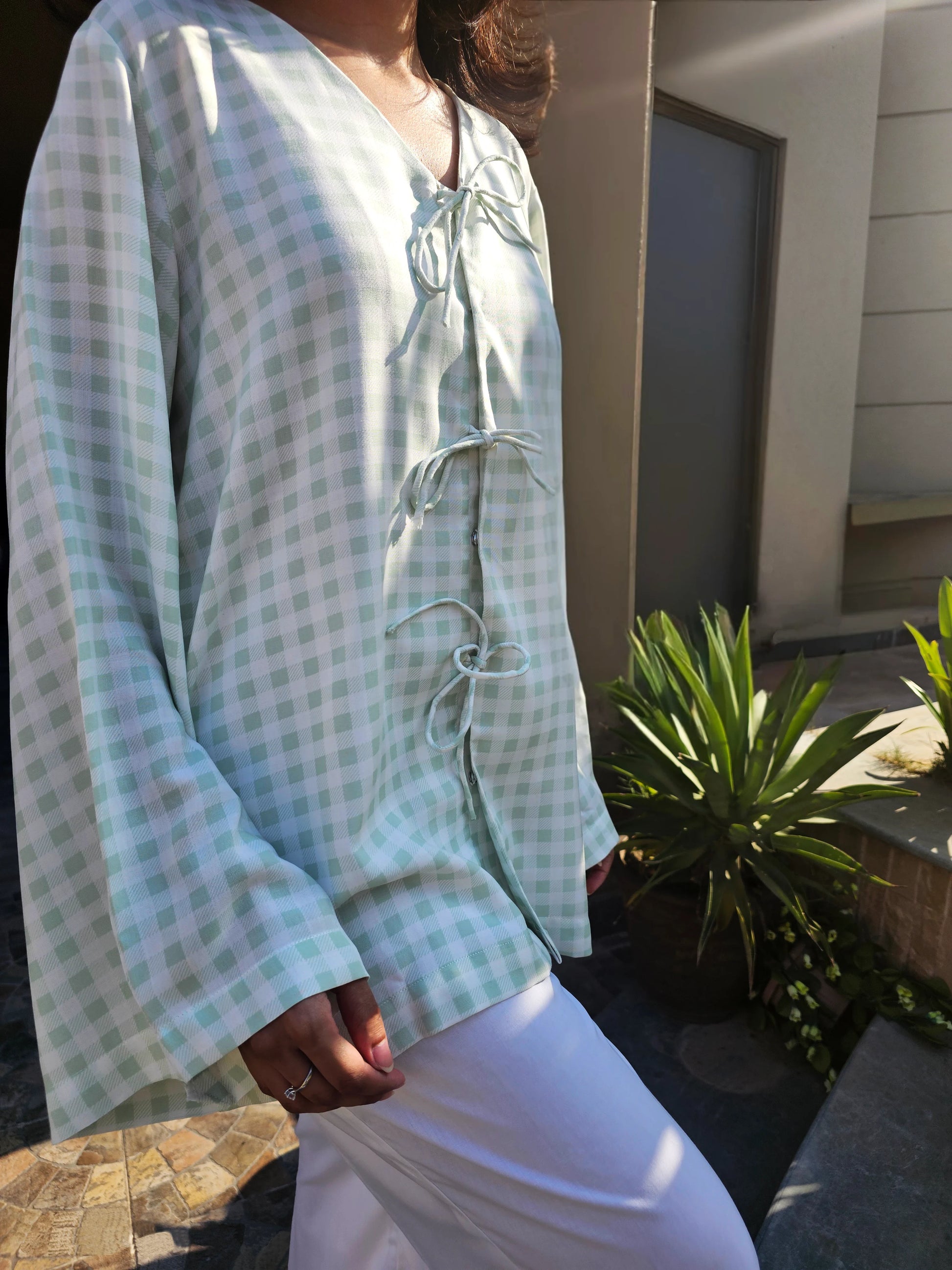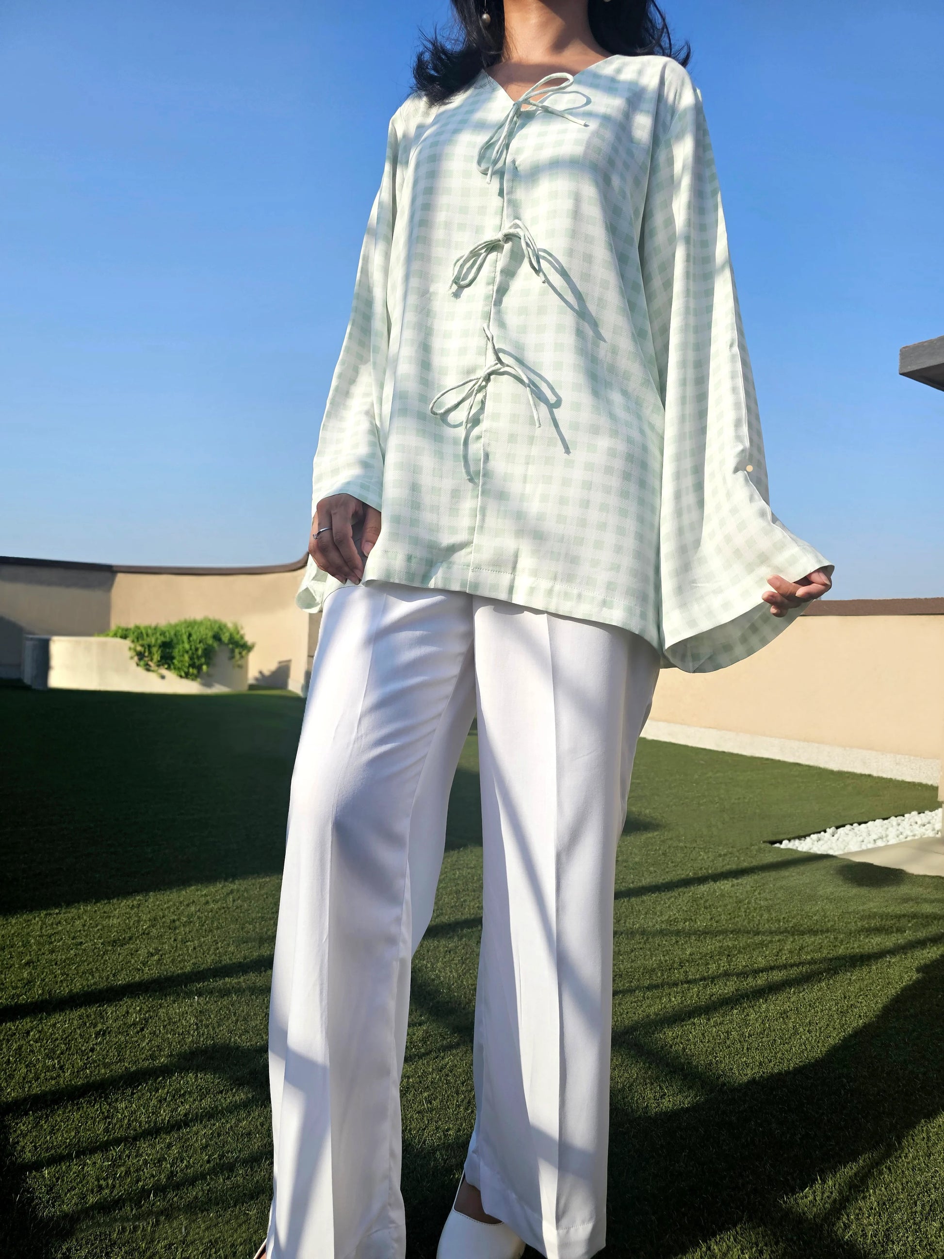 Delicate and effortlessly graceful, the Mint Green Checkered Co-ord Set captures soft summer romance in motion. The airy top, cut from fluid Arabic linen in a pastel mint check, features bell shaped sleeves and adjustable delicate bow ties that can be worn fastened or left open for a more relaxed look. Paired with wide leg cotton-blend trousers that drape like a dream, it’s a look that feels both ethereal and endlessly wearable.