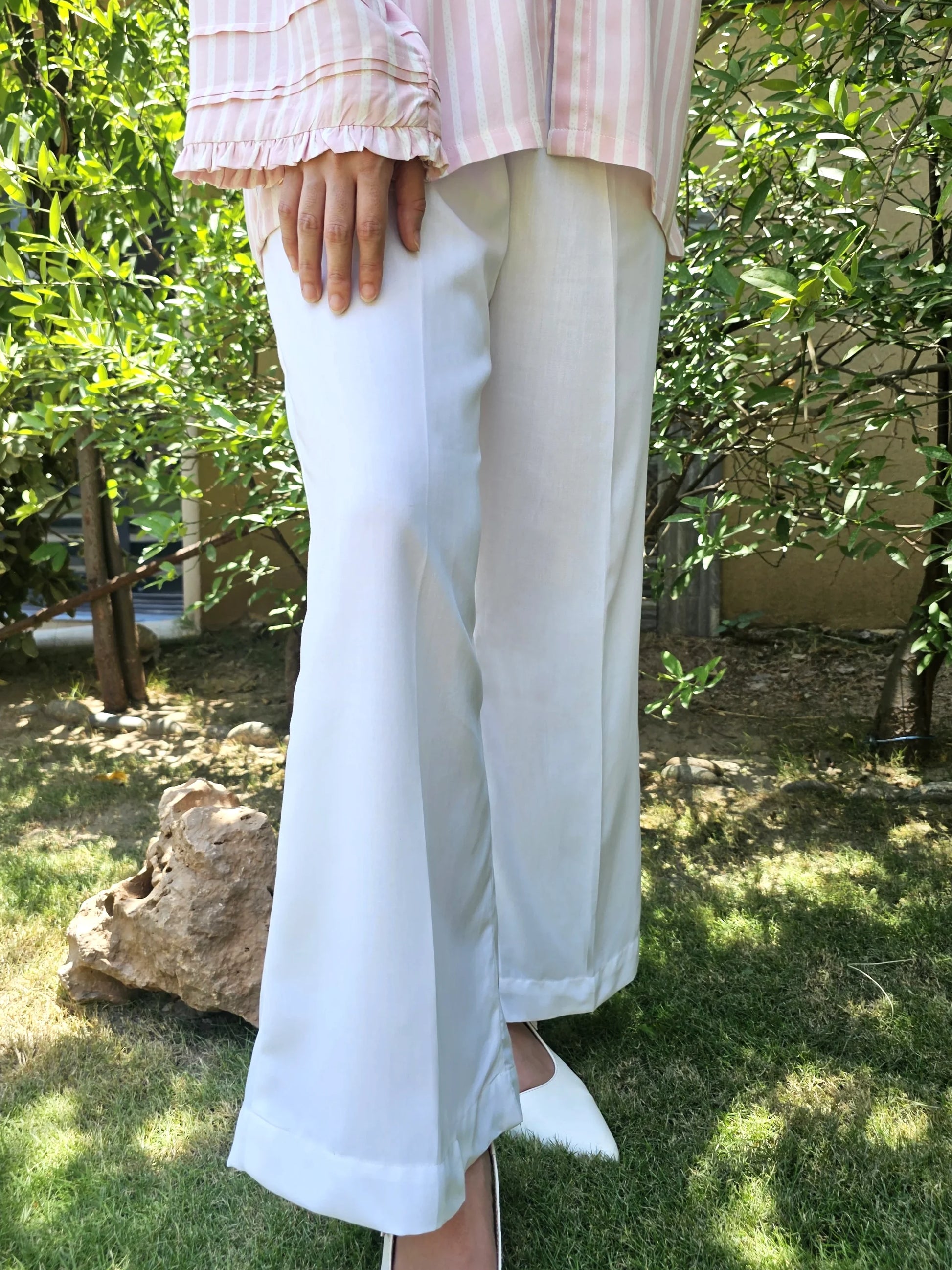 Crafted from airy Arabic linen, the Powder Pink Striped Co-ord Set's button-down shirt drapes beautifully with a soft, fluid fall — ideal for high temperatures. Lightweight yet structured, the fabric feels gentle on the skin and moves effortlessly with you. The frill trimmed sleeves and neckline add a delicate finish, while the relaxed fit creates a flattering yet easy silhouette. Paired with breathable wide leg cotton blend trousers, this set transitions seamlessly from casual plans to elevated moments.